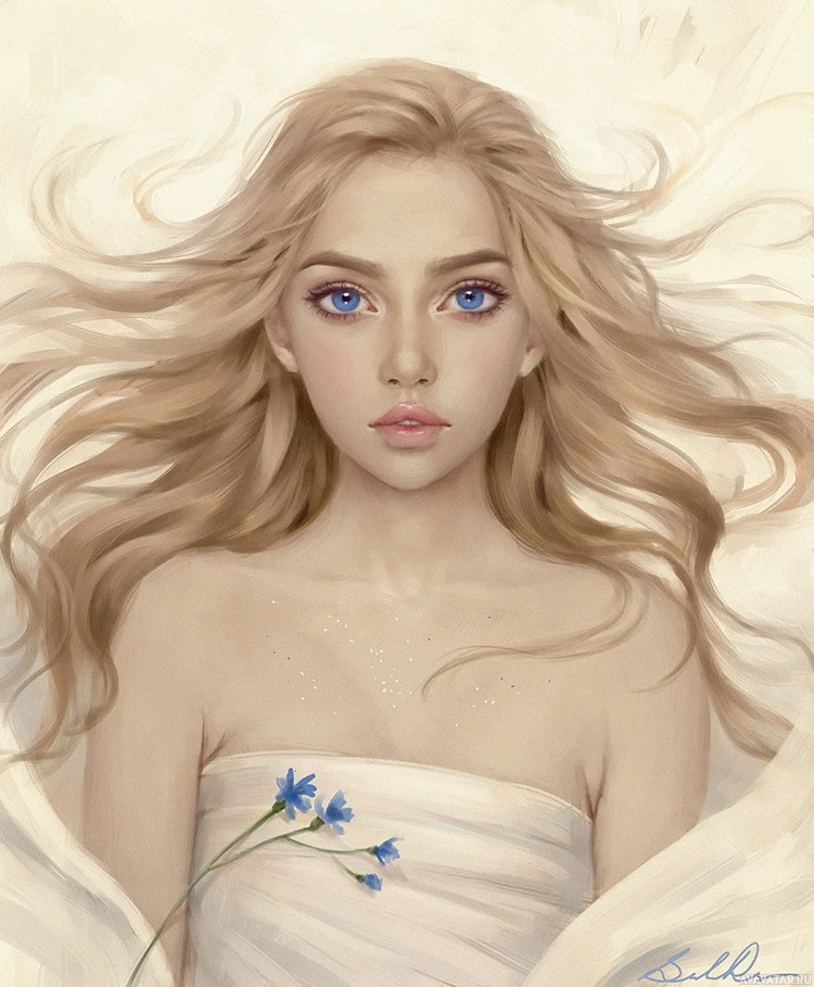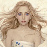 blonde hair and striking blue eyes. She has an ethereal, otherworldly appearance. Her hair is flowing gently around her face, suggesting movement or a breeze. She holds