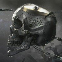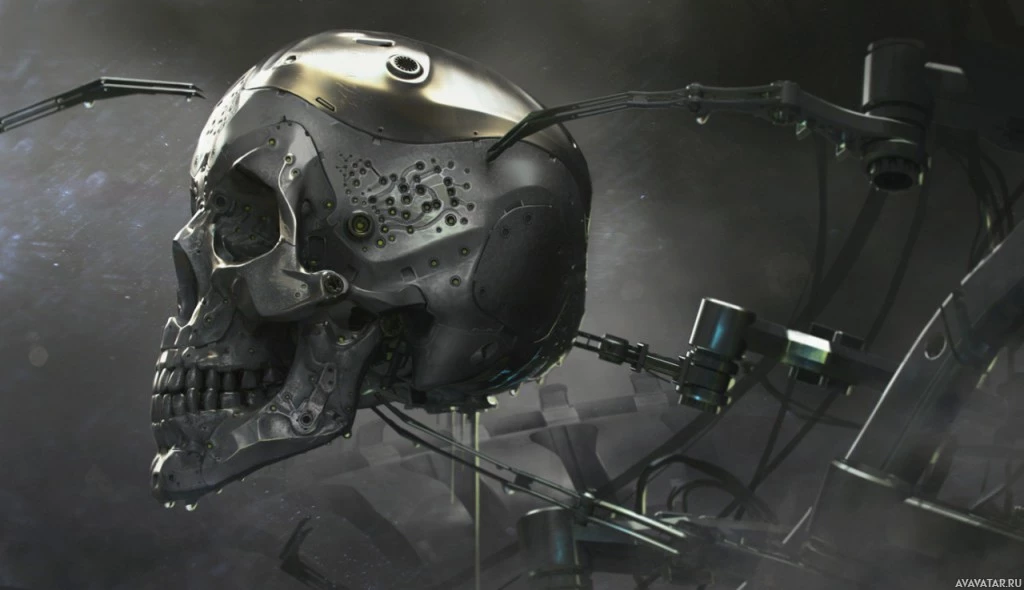 The image shows a skull with mechanical or robotic parts integrated into it. This creates a theme that blends organic and inorganic elements, which is often associated with