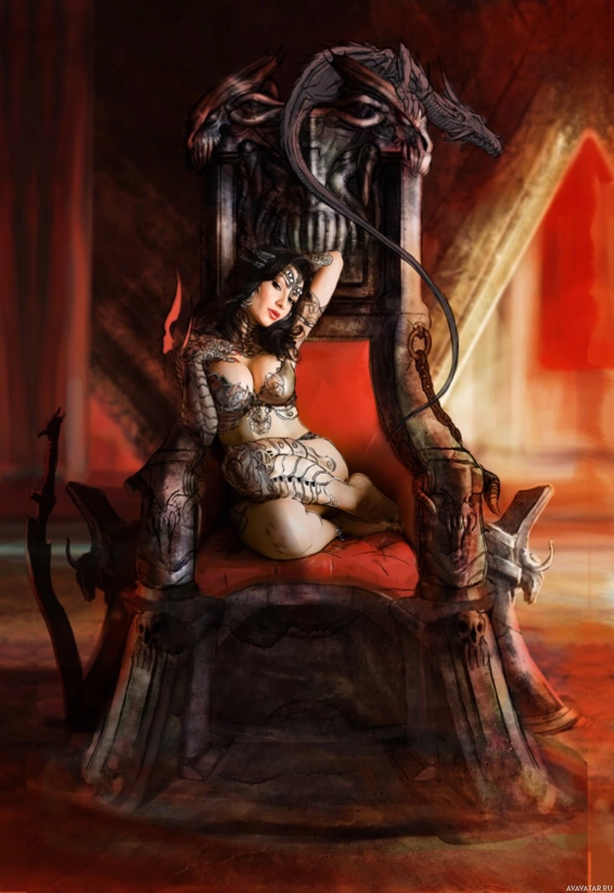 a fantasy scene featuring a woman sitting on an ornate throne. The setting appears to be a dark and moody interior, possibly a castle or dungeon, with red lighting that gives it a somewhat