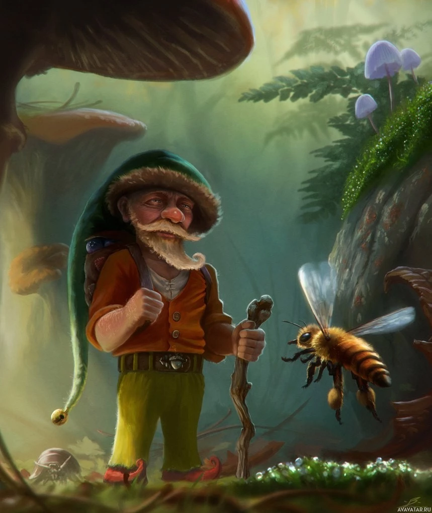 white beard and is wearing traditional dwarven attire with a hat that likely matches his outfit. In the foreground, there are two insects: one that looks like a large bee and another that could be