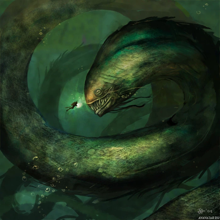 a fantastical scene featuring a large, menacing sea monster in an underwater environment. The monster has prominent features such as sharp teeth and appears to be in the midst of an attack or pursuit, as suggested by its wide-