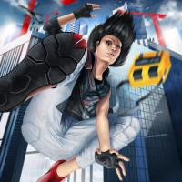 urban design. The character is wearing a white and black outfit that seems to be inspired by tactical or athletic wear, typical for