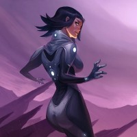 a young girl with dark hair. She is wearing a futuristic-