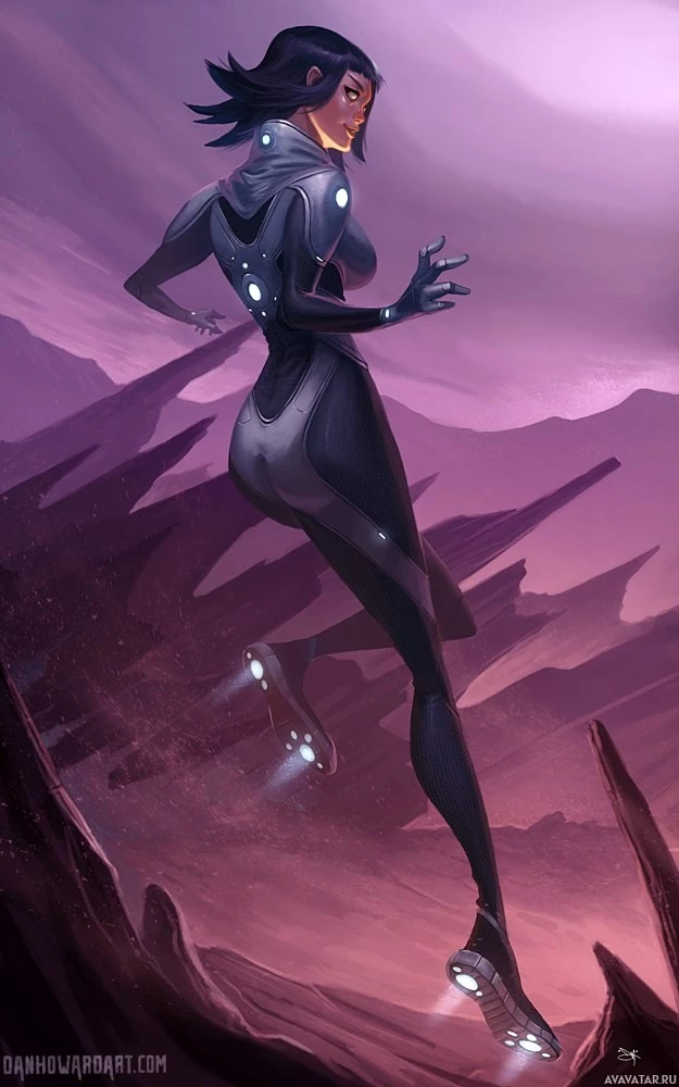 looking outfit that appears to be designed for travel or adventure in space or on other planets. Her posture and expression suggest movement or action. In the background, there are rocky formations that resemble