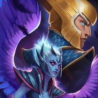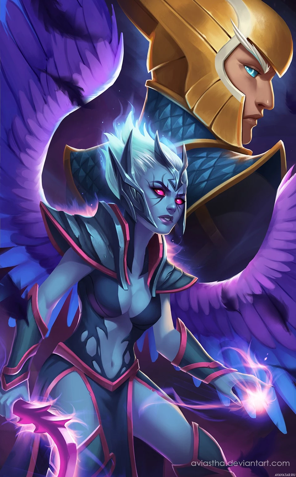 The image features two characters from the game Dota 2. On the left, there is a character known as "