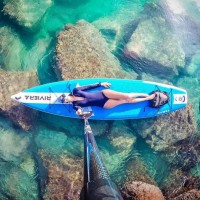 blue ocean waters with rocks visible beneath the surface, indicating that this activity is taking place in shallow areas of the sea.