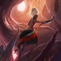 an action pose, as if she has just wielded her weapon. The setting seems fantastical or possibly from