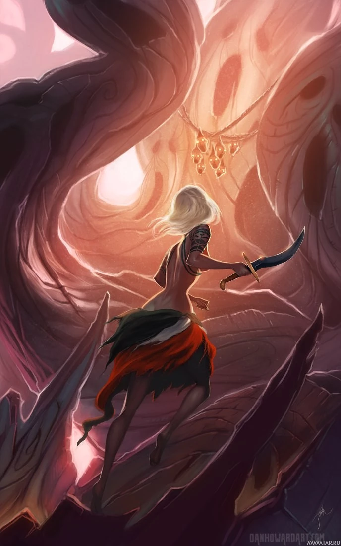 a video game or comic book, given the style and the presence of what looks like monsters or mythical creatures behind her. There are also other objects that resemble