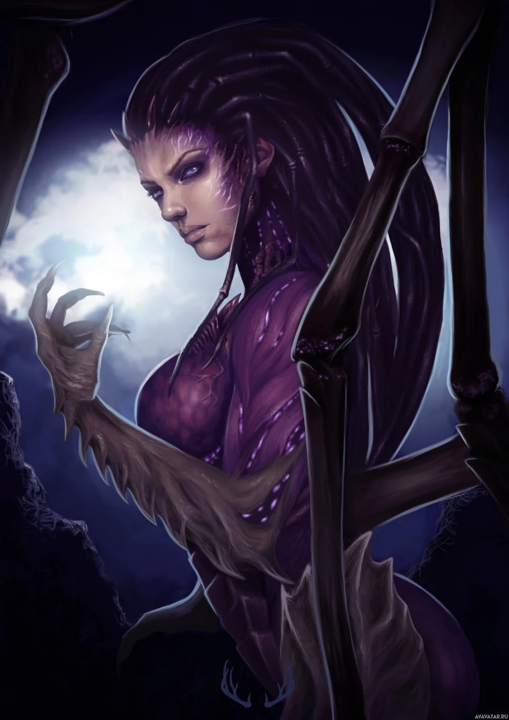 video game franchise, known as Kerrigan. She is depicted in her Zerg form, with purple skin and