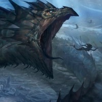 sharp teeth and is exhaling what appears to be blue smoke or mist from its nostrils. In the background, there are elements that suggest