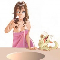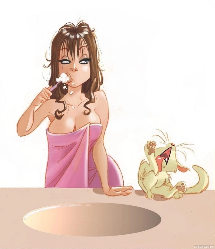 a girl in the bathroom. She is brushing her teeth and appears to be mid-motion, with her mouth open as if she's singing or speaking loudly. Beside her, on the countertop, there is a cat that seems to be imitating the girl by also opening its mouth wide as if it were also singing or yawning. The cat is looking up at the girl, seemingly engaged in this