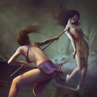 long hair that seems to flow like smoke and holds out what looks like a staff or wand towards the woman. The background suggests a swampy or marshy environment with fog or mist, enhancing