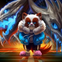 looking wings that are adorned with blue and black designs, suggesting a fantasy or magical element to the character. The background is dark and somewhat chaotic, featuring what appear to be energy bolts or magical effects emanating from the cat's hands, indicating some sort of combat or powerful
