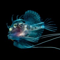 The image shows a deep-sea fish known as the fangtooth (Anoplogaster cornuta), characterized by its large mouth filled with sharp teeth. It is a type of anglerfish and can be found in the depths of the ocean.