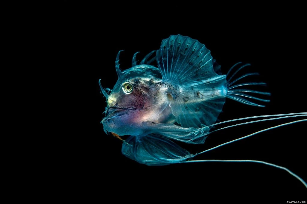 На картинке изображена глубоководная рыба, известная как клык (Anoplogaster cornuta), характеризующаяся большим ртом, заполненным острыми зубами. Это вид рыб и может быть найден в глубинах океана.