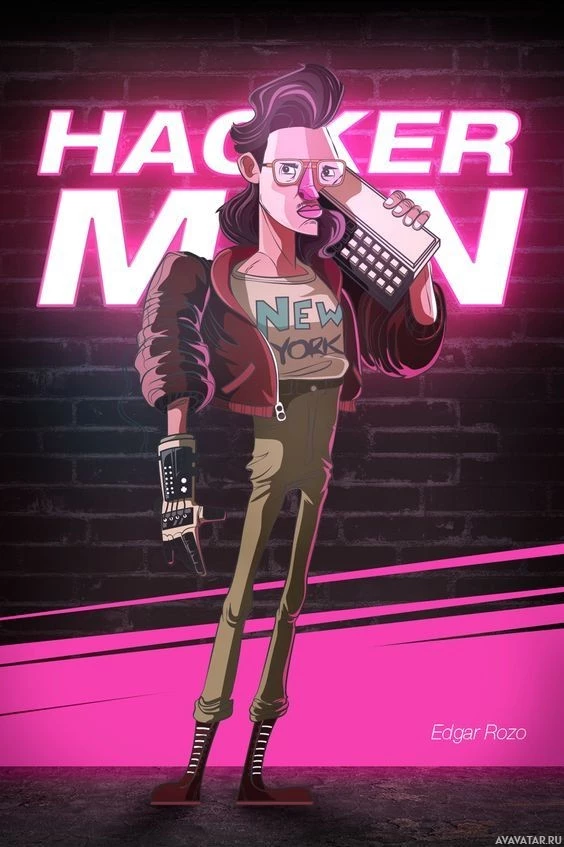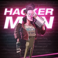 an illustrated character who appears to be a hacker, as indicated by the text "HACKER MAN" and the word "HACKER" prominently displayed. This character is styled in a punk rock fashion with a black