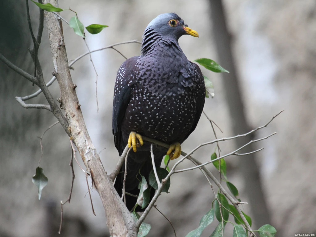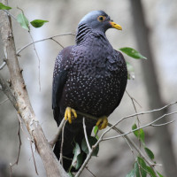 an outdoor setting, possibly a forest or park. The bird has distinctive speckled patterns across its body, which are characteristic of some