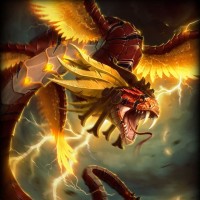 a dynamic pose, possibly attacking or ready for battle, with its mouth open to show sharp teeth and lightning effects around it, suggesting magical powers or energy. The style of the image suggests it could be from