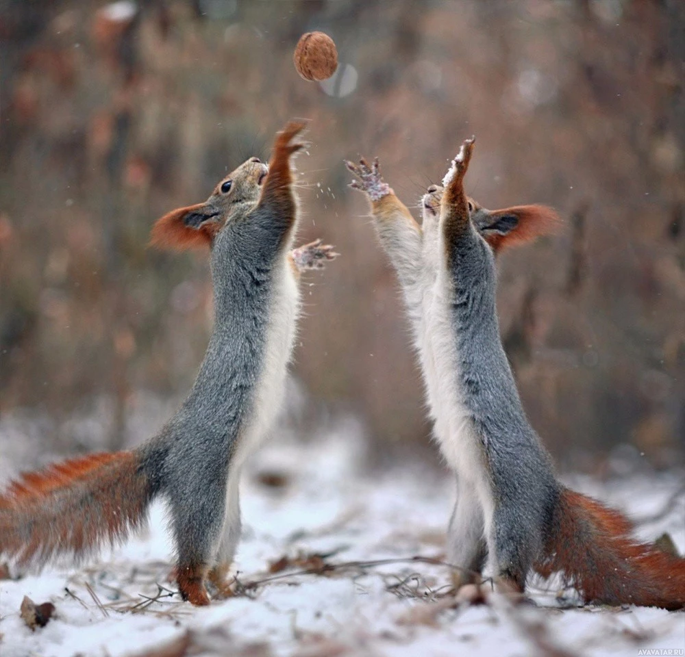 Картинка показывает двух красных белок, взаимодействующих друг с другом. Одна белка бросает или бросает что-то, возможно, еду или мяч, на другую белку, которая пытается поймать ее. Действие происходит в месте, которое выглядит как снежный лес.