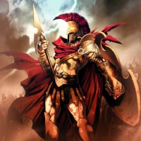 an ancient warrior or hoplite. This character is often associated with the classical gods of mythology and is shown here holding a lance in one hand, which could be a spear known as a doru, and a shield in the other hand, suggesting