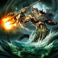 a fantasy character depicted as Poseidon, the ancient Greek god of the sea. The character is shown with a beard and