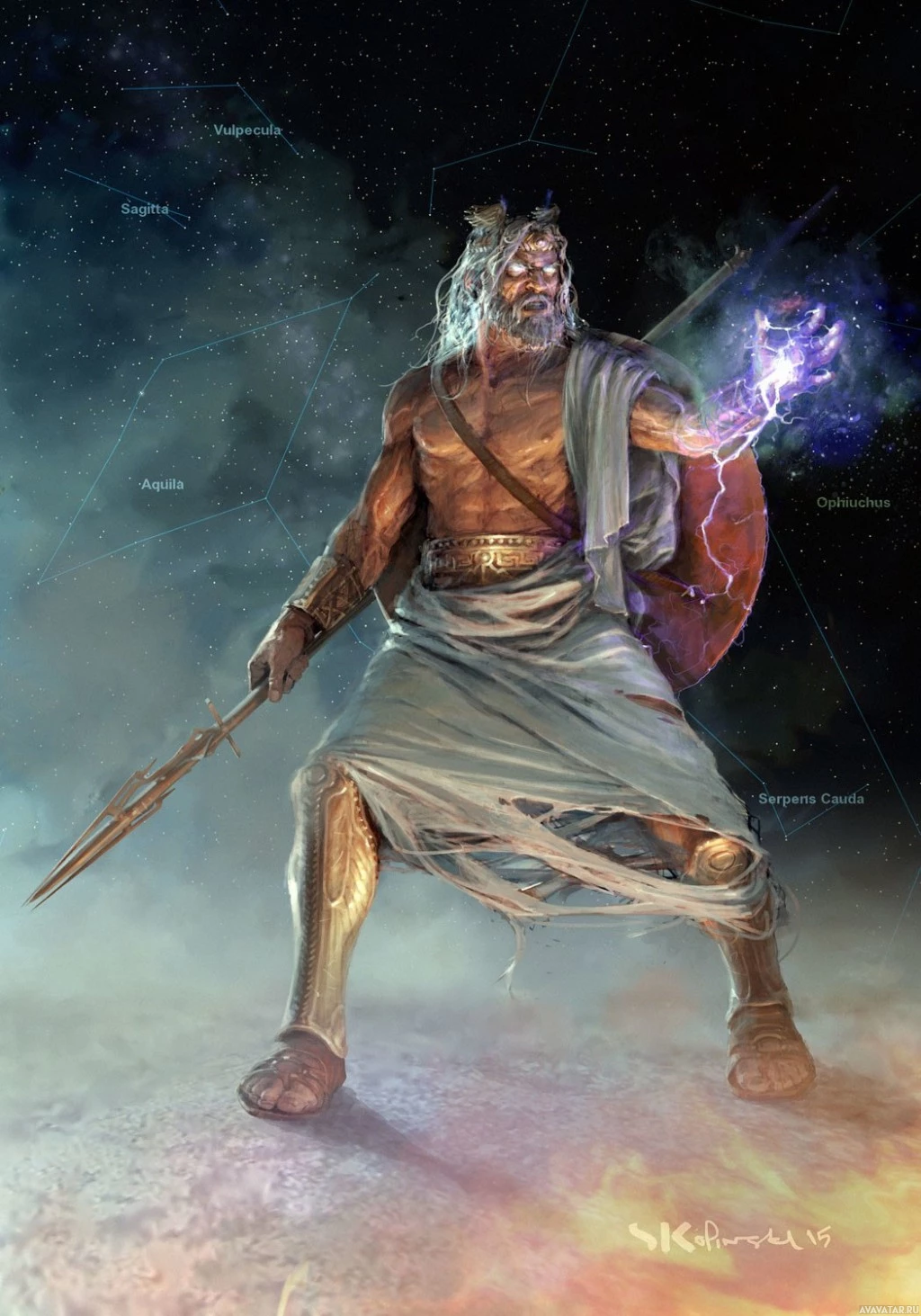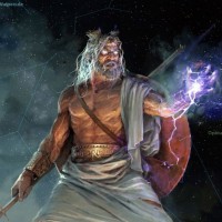 a work of art or fiction inspired by the figure of Zeus. The character is shown with a beard and