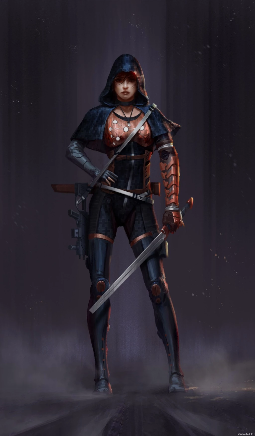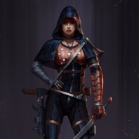 the video game "Assassin's Creed." The character is wearing a costume that includes elements of historical and fantastical design, with a hood, a corset, a skirt, boots, and carrying a sword. The setting appears to be a dark or moody environment, possibly an alleyway or rooftop, which fits the stealthy and shadowy nature often associated with assassins in the game's universe.
