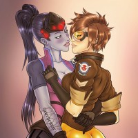 an intimate interaction. The image references "Overwatch," a popular multiplayer online game known for its diverse roster of heroes. The characters are likely fan-art interpretations from the game.