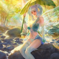 a natural setting, possibly in a forest or near water, as there are trees and rocks visible around her. The style of the image suggests it could be from an anime or manga series, given the stylized appearance of the character.