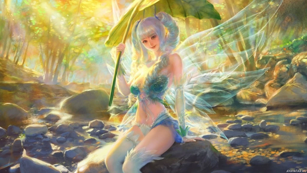 white hair, is sitting on the ground, and is holding a green umbrella. She appears to be in