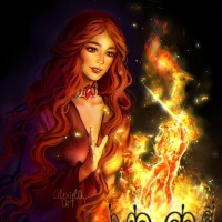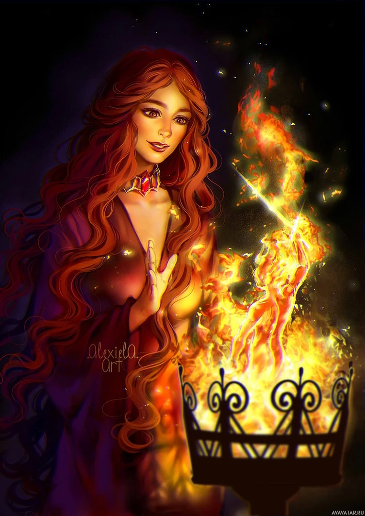 red hair, wearing an elaborate outfit that suggests a fantasy or historical setting. She appears to be casting a spell or engaging in some form of magic, as indicated by the flames surrounding her hand and the fire-like energy emanating from it. The background is dark and moody, possibly hinting at