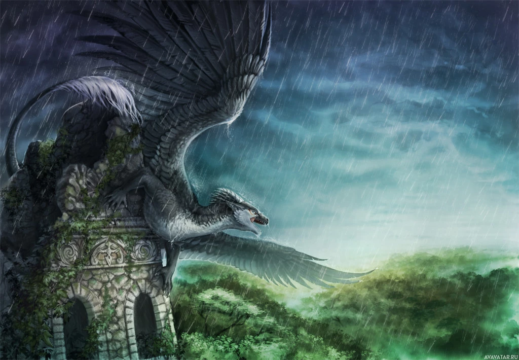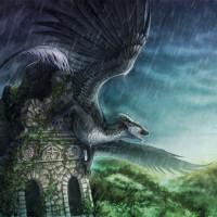 large wings and is perched on a rocky outcropping, overlooking a landscape that includes a castle or manor house partially obscured by mist. The sky is cloudy, suggesting it might be raining or about to rain. The overall atmosphere of the image conveys a sense of mystique and otherworldliness, typical of
