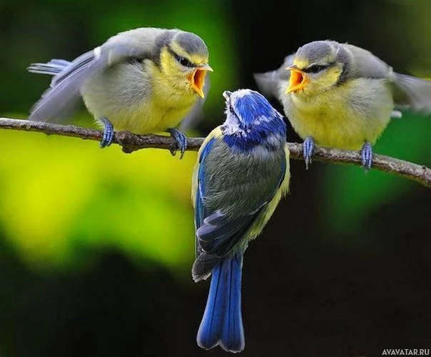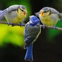 small birds with yellow and blue markings, which suggests they might be finches or similar species. One bird is perched in the middle of the other two, both of whom are facing away from it, appearing to look in