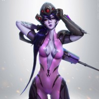 the video game "Overwatch," specifically Widowmaker, recognizable by her signature purple and white skin-tight bodysuit. She is holding