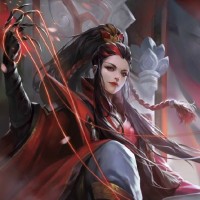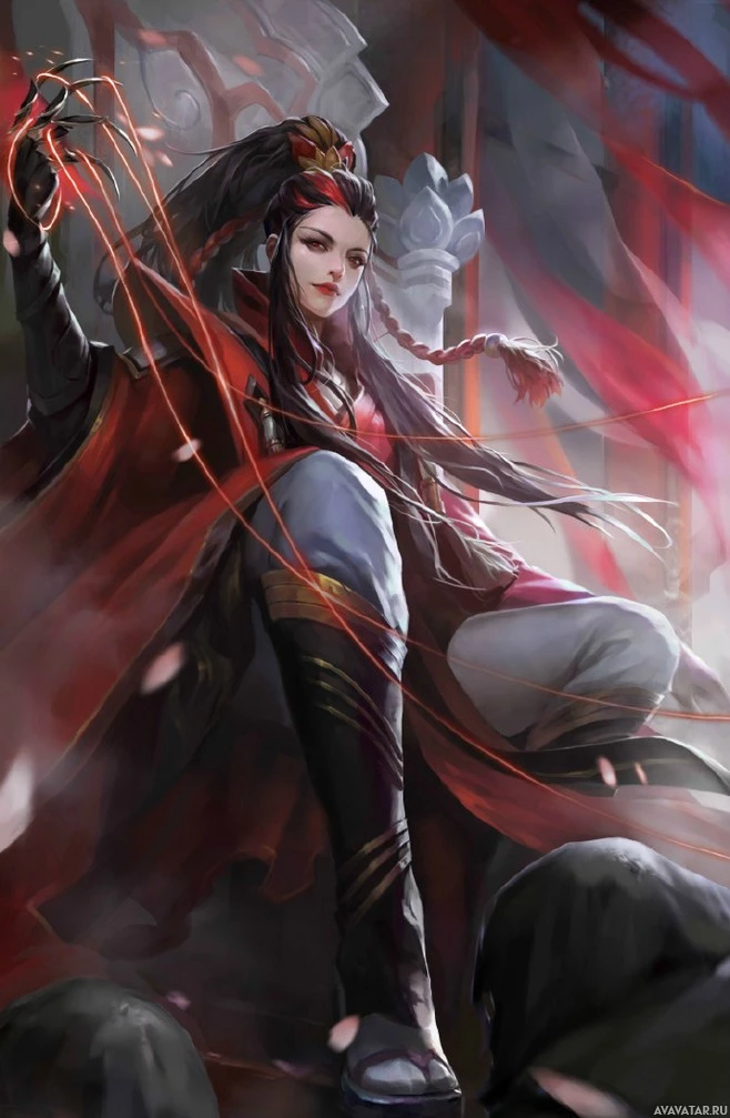 a female warrior or guardian. She is seated on what looks like a throne, with her right hand raised in a gesture that could suggest casting a spell or wielding power. Her attire is elaborate and colorful, with red and gold elements, suggesting a royal or mystical status. The background is dark and moody, with hints of