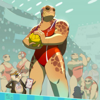 turtle character dressed in a swimsuit and goggles, holding a volleyball, indicating that it might be partaking in or about to participate in a water polo game. The turtle's muscular physique and