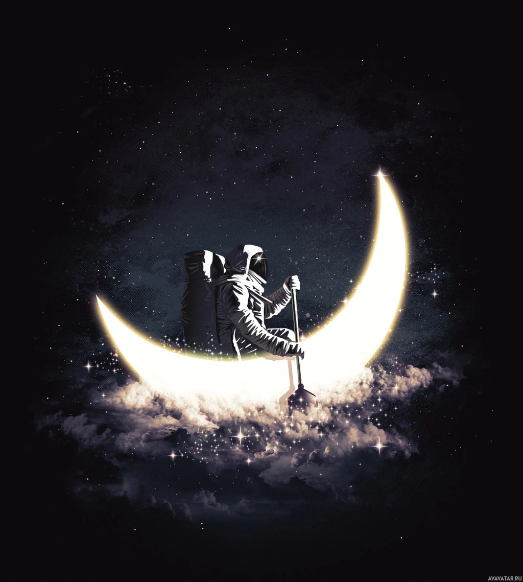 На картинке изображена ночная сцена с участием астронавта, сидящего на полумесяце. Астронавт держит то, что кажется рыболовным столбом, а рядом с ним рюкзак, предполагая, что он, возможно, исследовал или проводил эксперименты на лунной поверхности. Картина передает ощущение приключений и исследований в космосе.
