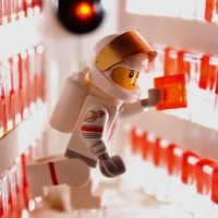 The image shows a Lego figure that appears to be designed as an astronaut. The character is wearing a spacesuit with a helmet and is in the process of opening or inspecting what looks like a locker or compartment with multiple drawers. The setting suggests a space-themed environment, likely a representation of a spacecraft.