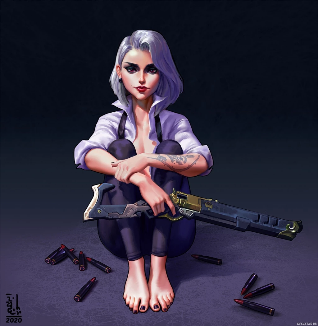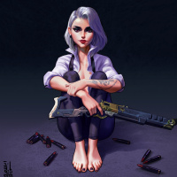 white hair and a somewhat serious expression. She is seated on the floor with one hand holding what appears to be a gun or weapon. There are various cartridges scattered around her, suggesting that she has been shooting or has recently done so. Her attire consists of a blouse and pants, with an exposed tattoo visible on her skin. The overall tone of the image is dark and moody, evoking